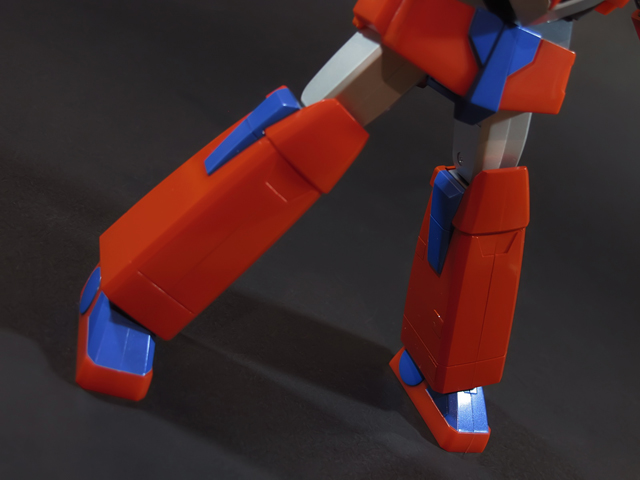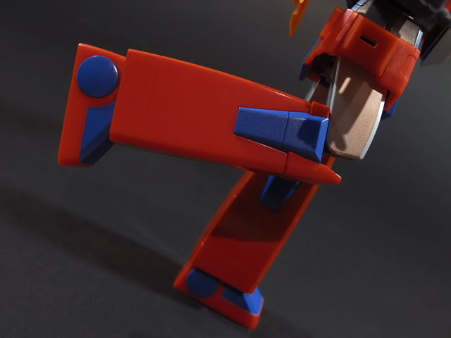 Estraendo Ace Redder dal suo alloggiamento la prima sensazione è innegabilmente fastidiosa e sgradevole, non fosse altro che per l’irrisorio peso di 210 grammi distribuiti sulla non indifferente altezza di 19.5 cm che tradiscono una composizione quasi totalmente in plastica (in metallo sono solamente la parte anteriore del torace al di sotto della pettorina removibile e le articolazioni di anca e spalla). Se infatti era lecito attendersi per questo componente (vista anche la posizione alta occupata nel robot) un contenuto in zama limitato pena il rischio di sbilanciare il Daioja una volta assemblato, era altrettanto plausibile aspettarsi qualcosina di più, che quasi certamente si sarebbe potuto fare. Ma plastica o metallo che siano ciò che in realtà lascia davvero sconcertati è la qualità della plastica stessa, se infatti si escludono le spalle che sono verniciate e (forse) le gambe, le restanti parti rosse del modello (praticamente tutte, in altre parole), sono colorate in pasta e presentano una tonalità che trasmette in modo tanto evidente quanto sconfortante una fortissima sensazione di giocattolo da bancarella che di rado, ma purtroppo sempre con maggior frequenza negli ultimi tempi, mi è capitato di avvertire con un SOC. Piccole imperfezioni di verniciatura costellano le parti grigie, sia a livello del fregio frontale (proprio in bella vista sulla testa del robot ma per fortuna è una cosa molto modesta) che sul braccio sinistro mentre una piccola ritoccatura di vernice fa bella mostra di se sul margine esterno della spalla destra. Abbondano sulle plastiche rosse e non solo i segni di distacco dalle sprue, gran parte dei quali distribuiti sul lato B del modello (in particolar modo sul retro di piede, gamba, coscia ed avambraccio), altri in posizione ben più scomoda come a livello degli inserti rossi ai lati della testa del robot, dove risultano veramente indisponenti. A questo punto vi chiederete mai se dopo simili critiche questo soggetto possa presentare un seppur minimo aspetto positivo. Ebbene si, fedeltà all’anime a parte (ineccepibile al 100%), la nota lieta arriva dal più che soddisfacente grado di posabilità (fallo anche essere impalato….). Le caviglie, ad attrito, hanno ampi movimenti di inclinazione laterale mentre le ginocchia, a scatto, si flettono fino ad un massimo di 90 gradi. L’anca ha notevoli escursioni in abduzione (quasi fino a 90 gradi) e discreta rotazione sull’asse longitudinale. Il busto, complice la necessità di realizzare un modello internamente cavo per consentirne la conversione, è privo di snodi. Le spalle, a scatto in rotazione (ampiezza di movimento 360 gradi), nei movimenti di abduzione (praticabili fino ad un massimo di 90 gradi) si comportano come articolazioni ad attrito. Le braccia sono rotabili sull’asse longitudinale a 360 gradi all’attacco con la spalla ed i gomiti, ad attrito, si flettono ad angolo retto. Le mani non sono intercambiabili, di fatto il robot ha un solo paio di mani preapplicate con movimenti modesti al polso (solo rotazione) e con dita tra loro fuse dall’indice al mignolo e snodate all’altezza delle nocche e dell’attacco del pollice alla mano così da permettergli di impugnare la spada (unica arma in dotazione). La testa, regolata da uno snodo a sfera, avrebbe potenzialmente buone possibilità di escursione, ma viene molto limitata in questo senso dagli inserti rossi ai suoi lati. La sensazione di fragilità almeno in questo elemento è comunque sempre ben percepibile. Personalmente, estraendolo, uno dei due avambracci telescopici (rientrano sulle braccia per ripiegarsi nel torace del robot nella trasformazione) mi è bellamente rimasto in mano (l’ho riapplicato senza problemi), in molti lamentano (almeno in questo a me è andata bene) l’instabilità della pettorina che tenderebbe a staccarsi ad ogni refolo di vento. Insomma, diciamo che si parte decisamente male! Nell’augurio che gli altri due mecha possano risollevare le sorti del modello accingiamoci ad estrarre Aoider dal suo alloggiamento…..
