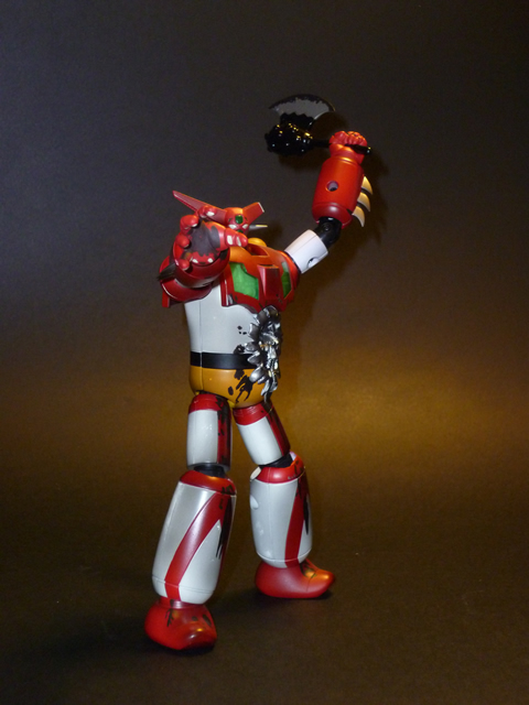 Purtroppo le linee che tendono a marcarne l’utilizzo in battaglia e della rottura del robot son fin troppo nette in alcuni punti e sembrano disegnate a pennarello. Molto meglio invece la rottura nel petto che sia come colore che come forma dà la sensazione di “estrazione”. Una delle “corna” del getter è spezzata ed anche li però l’effetto non è egregio, meglio invece l’effetto sporco sulle “antenne” laterali e sulla testa. L’effetto sporco generale invece rende meglio e si nota che la ditta in questione ha già dato prova della sua bravura in questo senso, tano è vero che l’effetto sporco/usato ricercato è abbastanza riuscito.