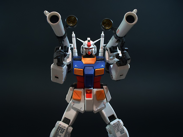 Il nostro Rx-78-2 è ovviamente provvisto di armi ed altri accessori che vengono impiegati per l’ottenimento delle varie configurazioni viste prima. Per completezza vado brevemente a descrivere le armi in dotazione, 2 Hyper Bazoka lunghi 16 centimetri con mirino fisso, possono essere agganciati singolarmente nel retro dell’ Rx-78-2. Beam Rifle è il classico fucile usato dal Gundam ed è lungo 9,5 centimetri, può essere impugnato indifferentemente a destra o a sinistra ed ha il mirino e la manopola orientabili. I 2 Shield sono gli scudi usati per la protezione dai colpi nemici, misurano 10,5 centimetri, uno è il classico con la stella gialla, il secondo invece è liscio con la sola scritta WB102 EFSF. La particolarità di questi scudi è che si possono sormontare grazie all’uso di un piccolo accessorio dando la possibilità al Gundam di averli entrambi in solo lato. Immancabili ovviamente le Beam Saber, sono le classiche spade laser che il Mobile Suit bianco estrae da dietro la schiena, agganciate la manico raggiungono la misura di 15,5 centimetri. Nella confezione sono presenti anche alcuni importanti accessori, abbiamo 2 manopole che servono per far sorreggere gli scudi all’ Rx-78-2 nella configurazione G-Armor, vengono agganciate nell’interno dei rispettivi Shield, aggancio singolo per posizionare lo scudo sul braccio mediante un perno che si va ad inserire nell’avambraccio, la particolarità di questo accessorio è che una volta agganciato lo scudo questo può essere fatto ruotare in qualsiasi direzione ed addirittura essere ripiegato all’indietro. La dotazione di accessori si chiude con un supporto che permette l’agganciamento del Gundam con le ruote cingolate del G-Fighter, questo ne assicura la tenuta nella configurazione G-Armor, tutte queste parti descritte sono in plastica verniciata con rifiniture perfette.