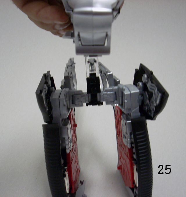 Una volta ripiegate le ginocchia su se stesse, premete sul quadratino nero mentre spingete le gambe all' interno del calcio.(fate la stessa cosa ma al contrario in fare di riconversione)Nelle foto tra la 21 e la 26 viene mostrato il corretto riposizionamento dei giunti delle gambe, è il momento più delicato fate attenzione.