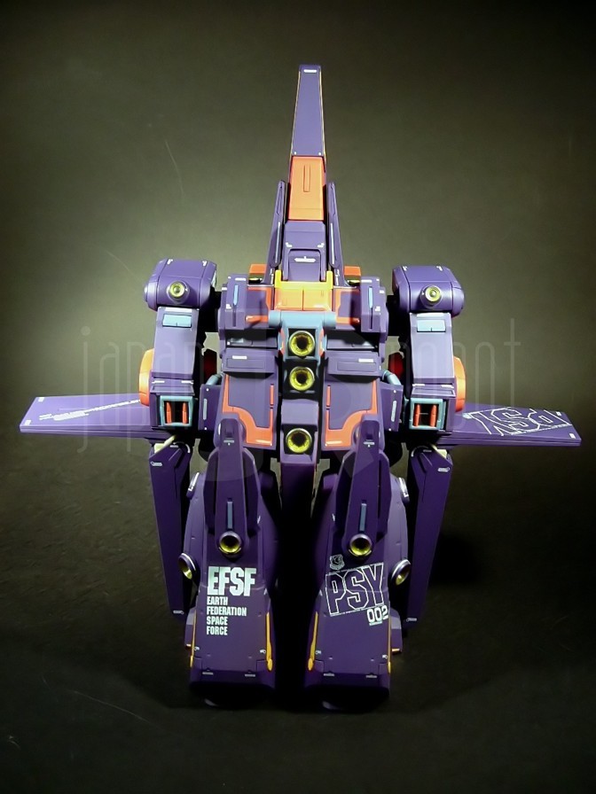 Pur non essendo un macigno il nostro Psycho si caratterizza per il fatto di essere probabilmente il più Metal tra i vari Metal Composite. Se infatti tale definizione è spesso considerata un'esagerazione visto l'esiguo contenuto in parti metalliche dei soggetti riprodotti per questa serie, in questo caso, nonostante la corazza esterna sia come al solito interamente in plastica, sono ben evidenti le componenti in zama che si rivelano in modo chiaro nel corso della conversione a fortezza volante concentrandosi principalmente in corrispondenza dello scheletro delle gambe, degli snodi di ginocchia, anche e spalle e parzialmente all'interno del tronco per un peso complessivo di 724 grammi che, se per un modello di 29 cm (ebbene si, sono 29 cm di altezza all'apice del fregio) è relativamente contenuto, nel complesso non risulta comunque così esiguo. La posabilità del modello, come nel suo predecessore, è molto limitata, in queso caso forse ancora di più. La cosa fortunatamente non disturba più di tanto data la relativa staticità della controparte animata. Le caviglie hanno buoni movimenti di inclinazione laterale ma scarsa capacità di flessione. Purtroppo le discrete escursioni laterali sono parzialmente vanificate dalla modesta abduzione delle anche. In parte si può ovviare a questo inconveniente tramite la rotazione laterale dell'intero arto inferiore (movimento consentito a livello dell'anca) in modo da permettere alle gambe di divaricarsi un po' di più. Le ginocchia, unica articolazione a scatto del modello, si flettono a non più di 30 gradi. I sei elementi del gonnellino (2 anteriori, 2 laterali, 2 posteriori) sono mobili grazie alla presenza di piccoli perni snodati che li ancorano al bacino. Il tronco è un blocco unico e privo di snodi, cosa intuibile dati i limiti imposti da una trasformazione che ne richiede la completa apertura. Le spalle ruotano totalmente ed hanno modestissimi movimenti di abduzione. Le braccia sono rotabili di 360 gradi sull'asse longitudinale ed i gomiti si flettono a 90 gradi. Gli avambracci sono staccabili permettendo così la simulazione delle beam swords (nell'anime venivano usati come armi a distanza sparabili che rimanevano ancorati alle braccia tramite cavi). Carino il fatto che la testa sia sganciabile proprio come nell'anime, è regolata da un perno che si articola alla base della testa con un sistema a sfera agganciandosi all'estremo opposto al tronco con un attacco calamitato. Ha movimenti limitatissimi, sia lateralmente quanto in flessione. Il fregio sulla fronte è intercambiabile, quello che troviamo già montato è di pvc morbido ed è questo che consiglio di tenere inserito per minimizzare il rischio di antipatiche rotture. L'altro fregio montabile ha invece il vantaggio di non piegarsi essendo in plastica rigida ma proprio per questo è a maggior rischio di eventuali rotture accidentali. Le mani sono appena due paia (due pugni chiusi e due con dita snodate a livello dell'attacco alla mano). Entrambe hanno perni snodati alla loro base così da permettere i movimenti di flessione rispetto all'avambraccio. La trasformazione in fortezza volante è tecnicamente concepita in modo ineccepibile, non si discosta minimamente dalla analoga conversione praticabile nel suo predecessore e come in quel caso, una volta ultimata, lascia molto dubbiosi sull'estetica di quanto ottenuto con tanta ingegnosa maestria. In altre parole, così come l'MRX-009, in MA mode anche l'MRX-010 somiglia a qualcosa di più simile ad un climatizzatore portatile che non a una minacciosa base volante. La raccomandazione sempre valida rimane comunque quella, qualora si volesse praticare la conversione (ne può sicuramente valere la pena almeno per valutare il validissimo lavoro ingegneristico fatto da Bandai), di fare molta attenzione nello sfregamento delle varie parti che inevitabilmente si viene a verificare, pena il rischio di fastidiosisime rigature della vernice. La verniciatura, appunto! Proprio questa è a mio modo di vedere il vero punto di forza del nostro modello. Bellissimo l'accostamento dei 4 colori dominanti (viola, rosso, giallo, azzurro) per un risultato cromatico decisamente accattivante e valorizzato dall'estrema precisione con cui sono stati curati anche i più piccoli dettagli, dalle pannellature degli inserti rossi alle markerizzazioni più minute che un po' ovunque impreziosiscono lo Psycho, il tutto in assenza di grossolani difetti. Bruttina invece la parte centrale dello scudo dove, una volta unite le due metà, sono evidenti elementi grigi non verniciati che stonano e non poco con la colorazione viola delle parti circostanti. Un peccato, visto e considerato che verniciatura a parte si tratta comunque di un prodotto asai curato anche in tutti gli altri dettagli, vedi i tappi coprivite sulla superficie interna delle cosce.