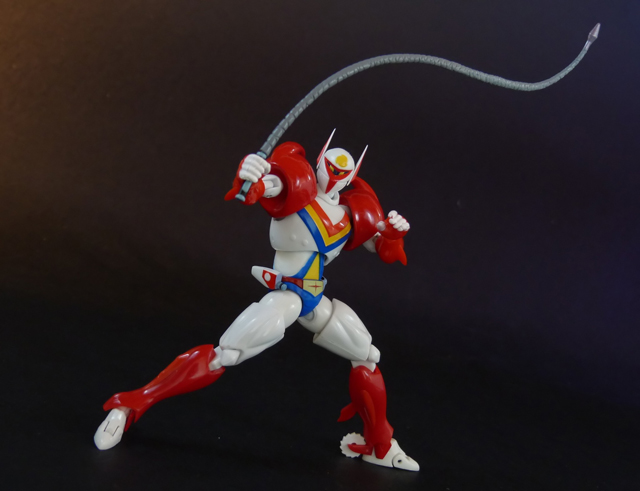 Appena lo libererete dal suo alloggiamento, noterete subito la pochezza dei suoi miserrimi 25 grammi: il Tekkaman CM’S altro non è che una semplicissima action figure di plastica di 12 centimetri. Il che certamente non sarebbe di per sé un male, dal momento che esistono sul mercato tonnellate di figure molto raffinate, come anche degli ibridi curatissimi come i Super Robot Chogokin Bandai, ma qui la fattura è decisamente anni luce indietro a questi esempi rendendo improbo un paragone anche con i semplici ma sempre apprezzati Revoltech. Infatti, la plastica utilizzata non è certo il massimo della qualità, quasi totalmente colorata in pasta, con qualche dettaglio verniciato sopra (nel viso, le caratteristiche strisce rosso-giallo-blu nel busto, e la cintura nel bacino) senza lesinare un sacco di sbavature e segnacci non troppo graditi. La posabilità teorica è decisamente ottima, garantita dai moltissimi punti di snodo: tre spappolose sezioni indipendenti per il busto, doppio snodo per gomiti e ginocchia, caviglie che ben si adattano alle ampie escursioni effettuabili dalle cosce al livello del bacino… ma una volta posato a terra, non riesce semplicissimo replicare quelle pose dinamiche, se non con una grande dose di pazienza e accertandosi di posare sempre i piccoli piedi in modo corretto, pena il crollo del figurino. Purtroppo la stabilità non è eccezionale, si avverte chiaramente l’assenza del metallo per lo meno negli arti inferiori o di qualsivoglia snodo un po’ più evoluto. E poi diciamolo chiaramente… senza un po’ di peso e sostanza non è che mi venga spontaneo associare questo mostriciattolo al metalloso Cavaliere dello Spazio che con violenza riduceva le navi di Waldaster in poltiglia spaziale… Davvero un peccato che abbiano riservato al nostro Tekkaman un trattamento così approssimativo, ma ancora peggio è andata agli accessori, purtroppo: tek-lancia e due tek-fruste in gomma, anche carine, che però non alloggiano con fermezza in nessuno dei tre manici disponibili, continuando a staccarsi con una facilità estrema trasmettendo al contempo una sensazione di sinistra delicatezza. Non ho avuto invece problemi con l’aggancio dei foderi ai fianchi di Tekkaman, contrariamente ad altri esemplari in cui l’operazione sembrerebbe ostica a causa dell’eccessiva morbidezza dei perni posti sui fianchi stessi.