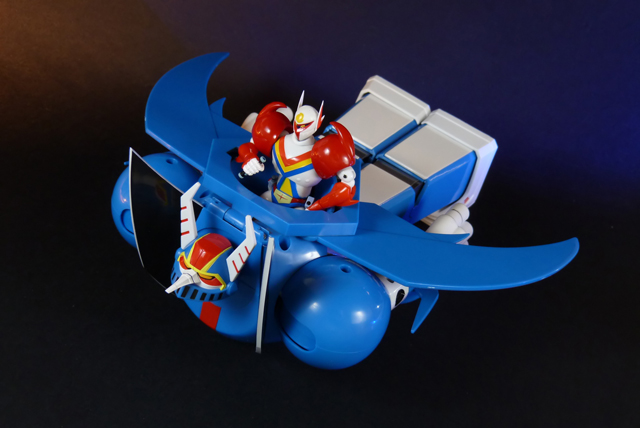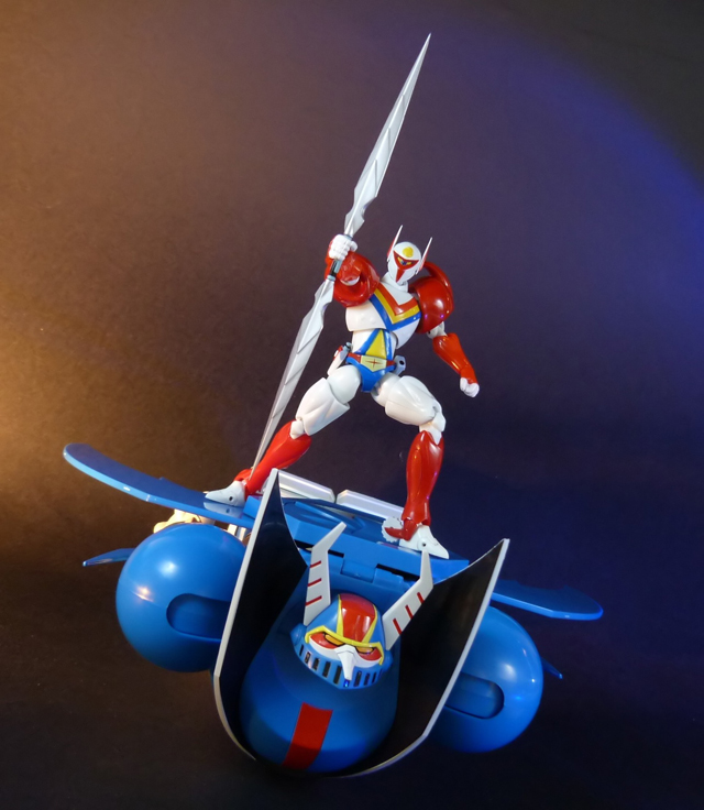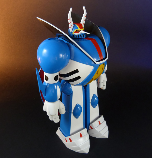 Altre jimmick degne di nota: la possibilità di aprire le ali, verniciate internamente di rosso, belle da vedere seppur virtualmente prive di dettagli; la presenza di uno sportellino apribile posto sulla schiena, concepito per permettere l’inserimento di Tekkaman all’interno di Pegas per vederlo poi uscire più incazzoso che mai, come nella famosa sequenza televisiva. Ecco giustificato il vuoto totale all’interno del busto del gokin nasuto, interno che tra l’altro è stato pure verniciato. Per chiudere lo sportellino bisogna invece sollevare tutto l’apparato comprendente le ali e agire poi dall’interno, complicando un po’ un’operazione che rimane comunque semplice.