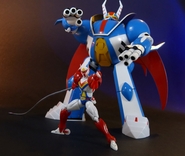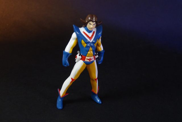 Compresa nella confezione troviamo anche questa statuina/gashapon di una decina di centimetri rappresentante George. L’ho trovata carina e dipinta in modo discreto, e anche il viso fortunatamente perde le fattezze suine che colpivano in negativo nelle foto promozionali, anche se non mi sembra ancora fedele al 100%. Molto strana invece la posa adottata… questo bacino tutto proteso in avanti mi perplime leggermente, ma giudicate voi stessi. Qualche informazione miscellanea: la testa può girare leggermente, si possono attaccare ai fianchi i foderi con pistole e come detto è previsto l’inserimento di George nelle gambe di Pegas per la trasformazione in Tekkaman. Simpatica.