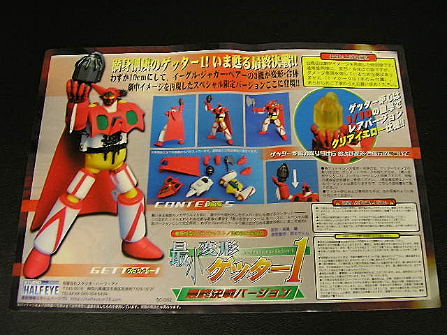 Nel 2003 Hajime Takashima pensò di allargare la base della sua clientela, includendovi coloro che desideravano un Getter trasformabile, ma non se la sentivano di investire un capitale nel Perfect Change Getter Robo.Nacque così la linea “Simple Change”, una serie di piccoli robot che dovevano replicare le trasformazioni viste negli anime, ma in maniera più… semplice, ricorrendo a parti aggiuntive, come pugni e piedi. Oltre alle dimensioni e ai gimmicks, anche i prezzi avrebbero dovuto essere più contenuti, benché modelli successivi come i Gravion difficilmente avrebbero potuto rientrare nella definizione di “economici”! Il primo robot della serie “Simple Change” fu l’SC-001 Getter One, nella versione tratta dai fumetti di Ken Ishikawa e dal restyle dell’OAV “The Last Day” e “Shin Getter vs. Neo Getter”. Si tratta di un piccolo e ingegnoso “toy” in grado di replicare la trasformazione delle tre Getter Machines nel solo Getter One. Dal medesimo stampo furono ricavate due edizioni limitate: “Mechanic” (300 pezzi) e “The Final Battle” (500 pezzi). Oggetto di questa recensione sarà proprio quest’ultimo, a ricordare la scena più epica del robot, il sacrificio del pilota Mushashi Tomoe che, strappando dal petto il generatore di raggi getter e sovraccaricandolo, si fa esplodere insieme ai Mechasaurus del Popolo Hachu!