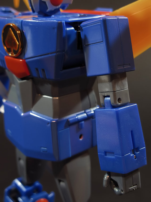 La fredda sensazione di metallo e di appagante consistenza ponderale che Aoider trasmette quando se ne afferra il tronco ci fa subito capire che a differenza del suo compare rosso, questo soggetto ha minori problematiche di familiarizzazione con il concetto di zama, e la bilancia non mente, i 282 grammi di peso per circa 20 cm di altezza ci fanno capire che finalmente la musica potrebbe cambiare. La quota di metallo, presente nell’intero blocco del tronco, in corrispondenza delle spalle ed a livello delle articolazioni di anche e spalle, rappresenta una percentuale nel complesso soddisfacente e comunque tale da rendere il modello degno del termine chogokin piuttosto che action figure. Ciò che balza però subito all’occhio è come il metallo, soprattutto se ripartito in modo squilibrato, finisca inesorabilmente per fare a cazzotti con la posabilità e ancor di più con la stabilità di un chogokin. L’Aoider, infatti, parrebbe avere in una estrema instabilità la sua principale pecca anche per il modo in cui, per necessità di trasfomazione, sono stati concepiti gli arti inferiori, apparentemente troppo esili ed instabili per dare un adeguato supporto al resto del corpo. Ma così non è, per fortuna. I tappi in dotazione con il modello per chiudere la pianta del piede ne migliorano, e di molto, il grado di stabilità, aiutati in questo da un piccolo perno in plastica che, applicato nel bacino del robot ne stabilizza le anche e ne ottimizza i movimenti. La verniciatura è buona, decisamente migliore di quella dell’Ace Redder, ed anche i distacchi dalle sprue, presenti solo sulla faccia posteriore e concentrati sulle parti blu, sono meno numerosi ed evidenti (principalmente piedi, ginocchia, margini inferiori degli avambracci), forse anche per il diverso colore delle plastiche in cui meno risaltano. Ancora una volta viene confermata la scarsa qualità dei materiali utilizzati, le venature che solcano la plastica blu colorata in pasta degli avambracci ma soprattutto dei pannelli ai lati della testa del robot sono, in una sola, semplice parola, brutte. Sulla posabilità abbiamo già detto qualcosa ma scendiamo nel dettaglio degli snodi. Le caviglie, per ragioni di trasformazione, sono cave e governate da uno snodo ad attrito localizzato sulla parte posteriore della gamba che permette movimenti di inclinazione discreti sull’esterno e modesti sull’interno anche se nutro qualche perplessità sulla eventuale tenuta nel tempo che con il passare degli anni potrebbe diventare scarsa per quelle che dovrebbero essere le necessità di carico dell’articolazione. Il ginocchio è a scatto e si flette fino a 90 gradi mentre l’anca, ad attrito, ruota sull’asse longitudinale a 360 gradi ma ha escursioni piuttosto limitate sia in flesso-estensione che in abduzione. Le spalle hanno uno snodo particolarmente rigido che funziona ad attrito in rotazione (movimento completo a 360 gradi) ed a scatto in abduzione (fino 90 gradi). Le braccia sono ruotabili longitudinalmente all’attacco con la spalla e le mani, come quelle dell’Ace Redder, non sono intercambiabili ma fisse e con snodo alle nocche ed alla base del pollice per permettere l’impugnatura delle armi. La testa ruota a 360 gradi presentando modesti movimenti sia in flessione ed estensione che di inclinazione laterale. Molto buona la fedeltà del soggetto all’anime, se infatti si escludono le cosce, forse un po’ tropo esili, è difficile eccepire qualcosa sulla rassomiglianza alla controparte animata. Le armi in dotazione, senza infamia e senza lode, sono l’alabarda ed il fucile con relativa fondina.