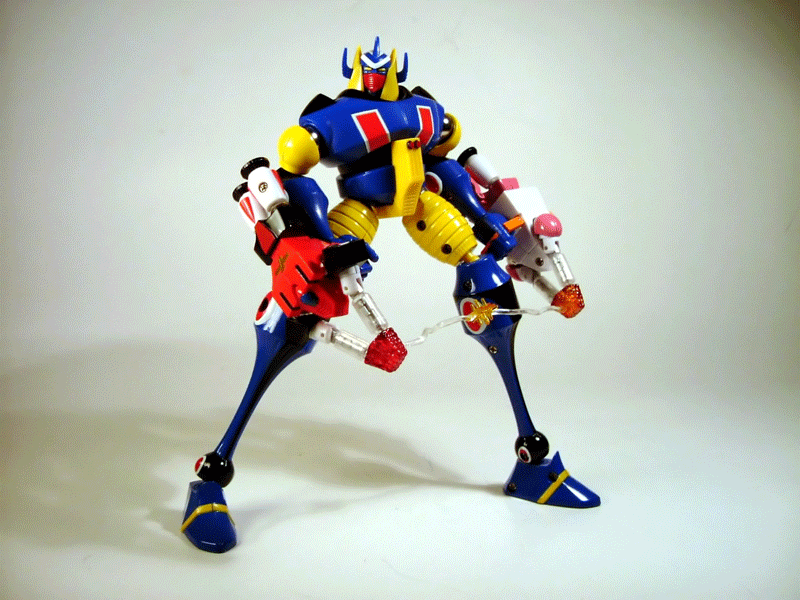Partiamo subito con i dati tecnici. Il modello è alto 18 cm per un peso, senza accessori, di 206 grammi.Le parti in metallo sono gli arti inferiori (per intero, piedi compresi) e le spalle. Tronco avambracci e testa sono invece in plastica. La stragrande maggioranza del peso del modello è in pratica concentrata dalla vita in giù. Le proporzioni sono assolutamente perfette, il modello è Gakeen, in tutto e per tutto e i dettagli sono curati in modo assai minuzioso sin nei minimi particolari con una verniciatura assolutamente impeccabile, perfetta in tutto e apparentemente resistente. Considerato che avevo aperto il Baldios prima del Gakeen sono rimasto sorpresissimo della assoluta discrepanza tra il curatissimo dettaglio di questo modello e la scarsissima cura impiegata in tal senso nel Baldios tanto da lasciar pensare, se uno non lo sapesse, che si tratta di toys prodotti da case diverse e non dalla stessa ditta (tra l'altro quasi in contemporanea). E veniamo adesso all'inevitabile confronto con un altro modello a magneti recentemente prodotto, il gx-42 Kotetsu Shin Jeeg di Bandai. Certamente il Gakeen ha una tenuta delle calamite ben più potente di quella del gx-42, si fa una certa fatica a staccare le gambe e le braccia dal tronco, indicando come la potenza delle calamite sia più rassicurante di quella modello Bandai. Purtroppo però anche in questo caso esiste la magagna: le cosce si allargano molto e le caviglie si piegano moltissimo per cui la posabilità sembrerebbe ottima ma così purtroppo non è per il semplice motivo che i piedi del modello sono interamente in metallo tendendo quindi a scivolare su qualsiasi superficie vengano poggiati facendo esibire il nostro eroe in spaccate degne della migliore Carla Fracci, aiutato in tal senso dal fatto che nonostante la potenza delle calamite alle anche la superficie liscia delle sfere tende comunque a scivolare nel suo alloggiamento. Un paio di feltri sotto la pianta del piede avrebbero risolto in questo caso qualsiasi problema a differenza dello Shin Jeeg in cui rappresentavano una toppa insufficiente a nascondere le ben più complesse falle del gokin. Tra i due modelli quindi vince certamente il Gakeen, ma anch'esso non è esente da pecche ed è un peccato soprattutto considerato il prezzo del modello. E' comunque possibile porre rimedio (anche se sembra assurdo dover mettere mano a un modello da più di 200 euro) con un paio di striscioline di scotch di carta così da aumentare l'attrito delle piante dei piedi sulle superfici di appoggio, in questo modo avrete in pochi minuti un Gakeen iperposabile e stabilissimo. Per aumentare la tenuta delle anche può essere invece sufficiente un doppio strato del normale cellophane da cucina a rivestire le sfere, visivamente non lo si nota e rende il modello solido come la roccia. A proposito dei piedi dobbiamo ricordare la piccola chicca del piede tagliente, la tipica lama che fuoriesce dalla pianta e che nel modello è estraibile. L'articolazione del ginocchio è a scatto ed è costituita da un perno in plastica incastrato in un alloggiamento di gomma all'interno della gamba. Inizialmente ho avuto difficoltà a piegare il ginocchio anche se i rischi di rottura del perno son praticamente nulli perchè se l'alloggiamento resta bloccatonella gamba il perno stesso fuoriesce (essendo l'alloggiamento in gomma) senza spezzarsi. Ho potuto mobilizzare l'articolazione semplicemente usando come leva il cappuccio di una bic e flettendo con forza il ginocchio. Fatta questa manovra per 2-3 volte l'articolazione si allenta e diventa libera di flettersi a 90 gradi. Brutto il particolare della linea di giunzione tra le due metà proprio sulla superficie anteriore della coscia evidentemente dettata da necessità tecniche. L'articolazione calamitata dell'anca è stata progettata in modo intelligente dal momento che la sfera di metallo non è fissa ma parzialmente estraibile così da permettere maggiori escursioni e soprattutto la possibilità di una flessione a 90 gradi, necessaria per mettere il modello in posizione seduta alla guida del Variant. Le spalle ruotano liberamente a 360 gradi ma i movimenti di abduzione sono limitati proprio per la conformazione dell'articolazione dal momento che spostando lateralmente la spalla il suo movimento viene a essere bloccato dal contatto col tronco. I pugni sono sparanti e maneggiando il modello per modificarne posa saltano che è una bellezza, hanno dita snodate fatta eccezione per il pollice che è fisso. Carino il dettaglio degli artigli d'acciaio estraibili dal dorso ma anche in questo caso, come nel Baldios, l'eccessiva parsimonia di CM'S nella dotazioni in mani si è fatta sentire: un solo paio!!! La testa essendo calamitata ruota completamente ed ha anche una buona capacità di estensione consentendo la riproduzione delle pose di volo. I due piccoli robot Plyzer e Mighty sono quasi totalmente in plastica, sono anch'essi calamitati (a livello di ginocchia, anche e spalle), sono curatissimi e riprodotti con precisione assai encomiabile. Bello il dettaglio del tronco apribile (nella serie anime questo si chiude quando i robot si trasformano nei razzi di supporto del Gakeen). Peccato che la loro posa sia difficoltosissima dal momento che alle anche, ma soprattutto alle ginocchia, la potenza delle calamite è così esigua da vincolare in modo del tutto insufficiente le suddette articolazioni. Questo problema, nel mio esemplare, è più accentuato nel Plyzer. Gli accessori sono completamente in metallo e in parte calamitati (le ali supersoniche sono agganciabili alle parti aggiuntive delle gambe e al Variant con attacco calamitato), hanno una verniciatura nel complesso buona. Tra di essi i miei preferiti rimangono le alabarde, la spada, le ali supersoniche e la lama atomica. Il Variant è enorme e detta sinceramente l'ho estratto dalla scatola solo per scattare le foto, subito dopo è ritornato nel suo alloggiamento dal quale non credo che lo farò più uscire dal mo