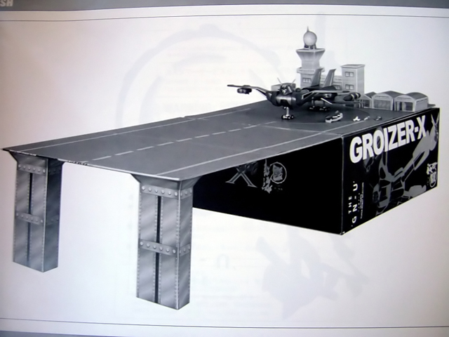 - Una busta di plastica trasparente contenente 5 fogli di cartoncino su cui sono stampate le varie parti di un papercraft da ritagliare e da assemblare con l'ausilio della scatola stessa e del contenitore in cartoncino che nella scatola accoglie i due blister. L'idea è decisamente carina anche se particolarmente poco pratica vista la cronica assenza di spazio per i collezionisti di gokin. Ad ogni modo è in questa maniera possibile riprodurre la base del Groizer che altro non è che una specie di aeroporto localizzato sull'isola di Akanè componendo così un diorama molto suggestivo, questa è certamente una nota di merito a favore di Yamato data l'originalità dell'idea.