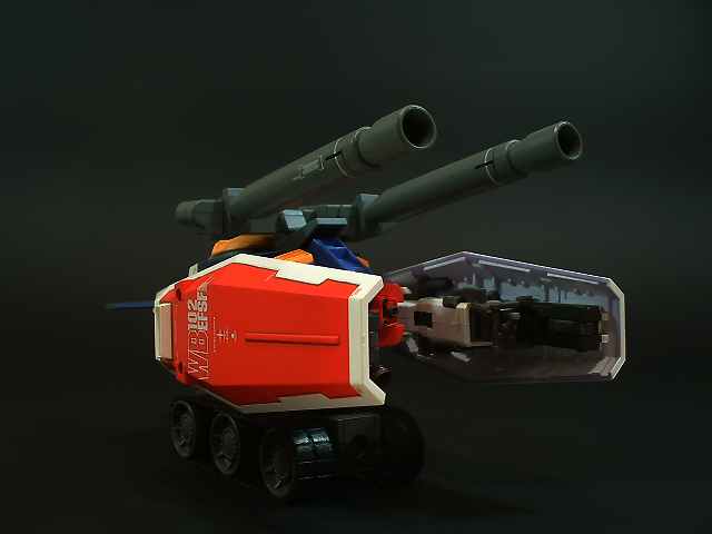 Il nostro Rx-78-2 è ovviamente provvisto di armi ed altri accessori che vengono impiegati per l’ottenimento delle varie configurazioni viste prima. Per completezza vado brevemente a descrivere le armi in dotazione, 2 Hyper Bazoka lunghi 16 centimetri con mirino fisso, possono essere agganciati singolarmente nel retro dell’ Rx-78-2. Beam Rifle è il classico fucile usato dal Gundam ed è lungo 9,5 centimetri, può essere impugnato indifferentemente a destra o a sinistra ed ha il mirino e la manopola orientabili. I 2 Shield sono gli scudi usati per la protezione dai colpi nemici, misurano 10,5 centimetri, uno è il classico con la stella gialla, il secondo invece è liscio con la sola scritta WB102 EFSF. La particolarità di questi scudi è che si possono sormontare grazie all’uso di un piccolo accessorio dando la possibilità al Gundam di averli entrambi in solo lato. Immancabili ovviamente le Beam Saber, sono le classiche spade laser che il Mobile Suit bianco estrae da dietro la schiena, agganciate la manico raggiungono la misura di 15,5 centimetri. Nella confezione sono presenti anche alcuni importanti accessori, abbiamo 2 manopole che servono per far sorreggere gli scudi all’ Rx-78-2 nella configurazione G-Armor, vengono agganciate nell’interno dei rispettivi Shield, aggancio singolo per posizionare lo scudo sul braccio mediante un perno che si va ad inserire nell’avambraccio, la particolarità di questo accessorio è che una volta agganciato lo scudo questo può essere fatto ruotare in qualsiasi direzione ed addirittura essere ripiegato all’indietro. La dotazione di accessori si chiude con un supporto che permette l’agganciamento del Gundam con le ruote cingolate del G-Fighter, questo ne assicura la tenuta nella configurazione G-Armor, tutte queste parti descritte sono in plastica verniciata con rifiniture perfette.