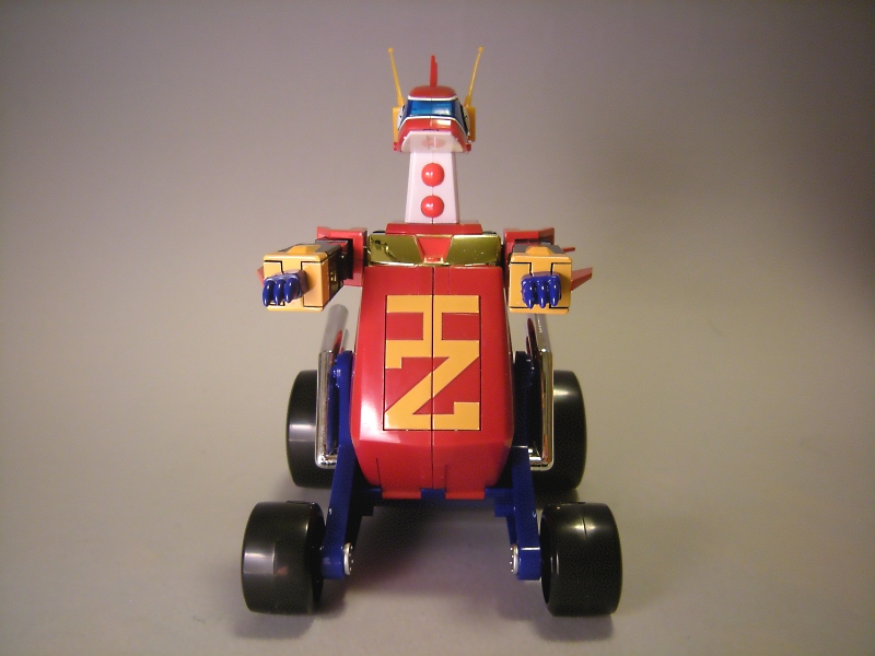 Il Gyakuten-Oh si ottiene tramite una semplice trasformazione del modulo centrale del Tokkyu Saurus e viene utilizzato da Go Sokkyu una volta trasformatosi in Ippatsuman. CM's per questa conformazione ha pensato a degli snodi semplici ma molto funzionali. Il fronte del Tokkyu Saurus presenta un disegno, che nell'anime originale scompariva al momento della trasformazione. Nel modellino la cosa é stata risolta utilizzando due pannelli ruotabili di 180 gradi. Quindi tutta la parte rossa viene fatta allargare e girata sulla schiena. Le gambe sono originariamente ripiegate all'indietro - un po' come per il Daikyojin/King Star in versione Sagittario - e vanno raddrizzate. Le braccia vanno abbassate. La componente della testa invece é un'astronavina a parte che raggiunge il robot al termine della sua trasformazione. Le mani del robot compaiono a seguito di una rotazione dei polsi. Difatti i lati delle braccia sono apribili, permettendo quindi alle zampe del Tokkyu Saurus di ruotare all'interno dello stesso avambraccio rivelando i pugni del robot a seguito del movimento di rotazione. Si tratta di un gimmick semplice e ad effetto, tuttavia lo spazio all'interno dell'avambraccio é molto risicato percui operare questo tipo di trasformazione può risultare più laborioso di quanto non sembri. A questo punto é preferibile staccare direttamente le zampe del dinosauro e inserire i pugni al loro posto.