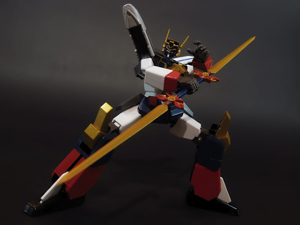 Estratto dalla confezione il chogokin trasmette subito una bella sensazione di rassicurante pesantezza, i 185 grammi distribuiti su 16 cm di altezza (calcolati all’apice delle due antenne ai lati della testa) non saranno da guinnes dei primati ma si difendono più che dignitosamente. Come in molti suoi predecessori, anche in questo Super Robot Chogokin la zama è concentrata quasi esclusivamente a livello degli arti inferiori, sono infatti di metallo i piedi e le parti esterne delle gambe mentre tutto il resto, con la sola eccezione del blocco dello snodo delle anche e della parte circolare esterna del diadema sul petto, è in plastica. La peculiare distribuzione dei pesi con localizzazione delle parti più pesanti negli arti inferiori ha nella notevole stabilità del modello anche nelle pose più estreme il suo vantaggio principale. Anche in questo caso, infatti (ma con i chogokin di questa serie la cosa non è ormai più una novità), abbiamo una posabilità al limite dell’impossibile, favorita dalle potenzialità estreme di praticamente tutti i punti di snodo del modello. Le articolazioni sono tutte ad attrito ma la cosa non dovrebbe porre problemi di tenuta neanche col passare degli anni viste le esigue sollecitazioni che gli snodi sono chiamati a sostenere soprattutto dal ginocchio in su, e cioè là dove il modello è più leggero. Analizzando nel dettaglio le giunture devo dire che ad una prima, superficiale valutazione, sono rimasto deluso dalle caviglie le quali parevano presentare movimenti molto limitati. In realtà è bastato dare un occhio al foglio di istruzioni per comprendere che gli snodi a questo livello sono estraibili tirando il piede in basso. Questo movimento cambia decisamente le carte in tavola facendo acquistare moltissimo soprattutto nell’inclinazione all’interno ed all’esterno del piede e di conseguenza alla posabilità dell’intero modello. Notevoli anche i movimenti di estensione del piede, favoriti dallo scorrimento dell’inserto bianco ancorato al dorso in una guida sulla faccia anteriore della gamba. Anche per il ginocchio è stato fatto un piccolo capolavoro tecnico. Come già osservato nello Zeorymer di questa stessa serie lo snodo del ginocchio è infatti articolato sia a livello della gamba (dove fa il grosso del movimento grazie anche alla concomitante mobilità dello sperone dorato) che all’attacco con la coscia dove assicura un supplemento di escursione tale da permettere alla gamba di flettersi totalmente sulla coscia con escursione fino a 180 gradi. In particolar modo quest’ultimo movimento è permesso dallo scorrimento delle due metà anteriore e posteriore della coscia l’una sull’altra, una interessantissima soluzione finora mai apprezzata in un chogokin ma solo a livello di kit. Altro snodo altra goduria: le anche consentono di realizzare praticamente tutti i movimenti desiderabili grazie anche alla mobilità, permessa da perni a sfera, dei tre elementi (anteriore, posteriore e laterale) del gonnellino in modo tale che essi non siano di impedimento. La coscia infatti può essere flessa ed abdotta a 90 gradi ed estesa quasi nella stessa misura nonché discretamente ruotata sull’asse longitudinale. Il tronco è dotato di due snodi, uno al passaggio bacino-addome (dove modula movimenti di torsione) e l’altro, estraibile, allo stacco addome-torace (dove invece regola la flessione in avanti del torace stesso, implementabile con l’estrazione dello snodo). Le spalle ruotano a 360 gradi ed hanno buone escursioni in flessione ed estensione. Questa ampia libertà di movimenti conferisce pertanto ottima posabilità anche a livello delle braccia permettendo quindi al gokin, per esempio, di impugnare a due mani le spade sollevandole sopra alla testa. Le braccia ruotano liberamente sull’asse longitudinale all’attacco con la spalla, lo stesso fanno gli avambracci al passaggio col gomito. Il gomito è flessibile ben oltre i 90 gradi mentre i polsi hanno discreti movimenti di inclinazione e di flessione-estensione (un po’ scocciante il fatto che per cambiare mano spesso il perno se ne venga via con la mano che si vuole sostituire e debba essere riapplicato). Il collo è dotato di due snodi a sfera, uno all’attacco col torace e l’atro all’aggancio con la testa. Questa soluzione implementa notevolmente la mobilità della testa garantendole rotazione a 360 gradi, inclinazioni laterali, estensione e flessione estreme. Anche i reattori del backpack sono mobili e parzialmente inclinabili. La verniciatura è nel complesso molto buona e curata, fatta eccezione per un paio di segni di distacco dalle sprue localizzati nella parte inferiore della faccia posteriore delle gambe e su qualche impugnatura delle spade (peccati veniali a onor del vero) non ho constatato particolari imperfezioni. Plastiche grigie un po’ discutibili quanto a qualità, sia a livello del backpack che degli elementi laterali del gonnellino. Senza infamia e senza lode gli accessori nonostante la discreta ricchezza in spade dell’armamentario anche se devo ammettere che impugnando lo spadone il modello risulta molto scenografico. Bella la lancia realizzabile dall’unione delle due spade dorate con l’apposito connettore.