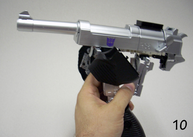 620gr x 32 cm di altezza il nostro Destron leader si caratterizza anche lui per la prevalente presenza di plastica e l' assenza quasi assoluta di zama.In perfetta scala con i precedenti pm 01/04 ne fanno un partner ideale in vetrina, diciamo uno step successivo obbligato.Pur non essendo uguale al 100% alla sua rappresentazione animata, non si fatica a riconoscerlo, serafica forse l' espressione facciale ma il mentone ed i ciglioni sono i suoi.Emozionanti gli occhi metallici rossi ed incastonati.Il robot pare ben proporzionato a parte la cronica magrezza delle gambe per via della trasformazione.A differenza dell' mp 01/04 non ho notato presenze di rimasugli di sprue palesemente evidenti, mentre critico le cromature che solo dopo due contatti tendono a opacizzare.La testa è dotata del classico giunto sferico nulla di particolare, mentre è simpatica la possibilità di modificare l' espressione facciale operando sull' elmo che alzandosi ed abbassandosi nasconde i ciglioni di Megatron.Articolazioni delle spalle sufficienti, limitate in abduzione ruotano comunque di 360 gradi.In prossimità dei gomiti, complice la trasformazione, si ha un doppio snodo sfruttabile anche per pose improbabili ma comunque al limite dell' accettabile.Il polso ruota e si torce leggermente mentre le dita sono articolate singolarmente.Il tronco è fisso senza nessuna possibilità di movimento ma la trasformazione regala a Megatron un bacino munito di balestra semirigida che gli dona la possibilità di flettersi lateralmente. (purtroppo anche più del dovuto e con il mirino/cannone sul braccio pende inesorabilmente sul suo peso.)Le gambe sono munite di ben 4 punti di snodo che in teoria permetterebbero infinite posizioni, limitate invero nella pratica dal peso del mirino se applicato al braccio e dalla misera capacità abduttiva donata dal balestrone nel bacino.Le caviglie sferiche permettono rotazioni a 360 gradi e la parte a copertura del piede consente di bloccarli in posizione.