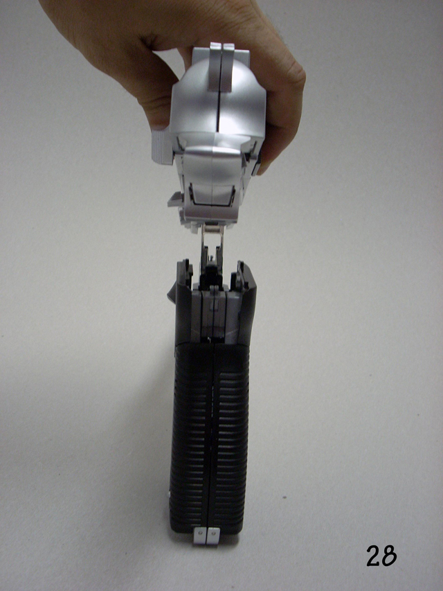 Una volta ripiegate le ginocchia su se stesse, premete sul quadratino nero mentre spingete le gambe all' interno del calcio.(fate la stessa cosa ma al contrario in fare di riconversione)Nelle foto tra la 21 e la 26 viene mostrato il corretto riposizionamento dei giunti delle gambe, è il momento più delicato fate attenzione.