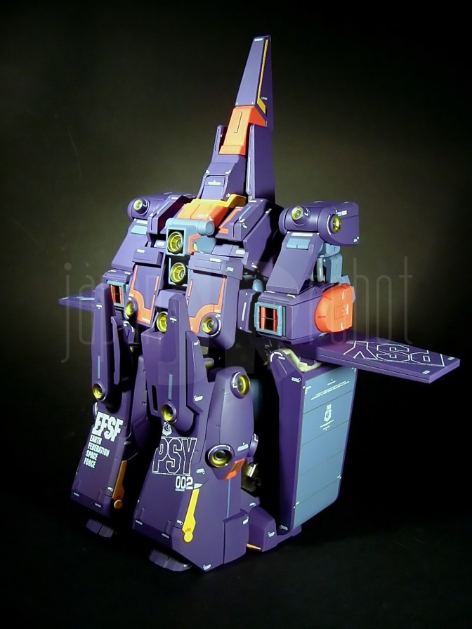 Pur non essendo un macigno il nostro Psycho si caratterizza per il fatto di essere probabilmente il più Metal tra i vari Metal Composite. Se infatti tale definizione è spesso considerata un'esagerazione visto l'esiguo contenuto in parti metalliche dei soggetti riprodotti per questa serie, in questo caso, nonostante la corazza esterna sia come al solito interamente in plastica, sono ben evidenti le componenti in zama che si rivelano in modo chiaro nel corso della conversione a fortezza volante concentrandosi principalmente in corrispondenza dello scheletro delle gambe, degli snodi di ginocchia, anche e spalle e parzialmente all'interno del tronco per un peso complessivo di 724 grammi che, se per un modello di 29 cm (ebbene si, sono 29 cm di altezza all'apice del fregio) è relativamente contenuto, nel complesso non risulta comunque così esiguo. La posabilità del modello, come nel suo predecessore, è molto limitata, in queso caso forse ancora di più. La cosa fortunatamente non disturba più di tanto data la relativa staticità della controparte animata. Le caviglie hanno buoni movimenti di inclinazione laterale ma scarsa capacità di flessione. Purtroppo le discrete escursioni laterali sono parzialmente vanificate dalla modesta abduzione delle anche. In parte si può ovviare a questo inconveniente tramite la rotazione laterale dell'intero arto inferiore (movimento consentito a livello dell'anca) in modo da permettere alle gambe di divaricarsi un po' di più. Le ginocchia, unica articolazione a scatto del modello, si flettono a non più di 30 gradi. I sei elementi del gonnellino (2 anteriori, 2 laterali, 2 posteriori) sono mobili grazie alla presenza di piccoli perni snodati che li ancorano al bacino. Il tronco è un blocco unico e privo di snodi, cosa intuibile dati i limiti imposti da una trasformazione che ne richiede la completa apertura. Le spalle ruotano totalmente ed hanno modestissimi movimenti di abduzione. Le braccia sono rotabili di 360 gradi sull'asse longitudinale ed i gomiti si flettono a 90 gradi. Gli avambracci sono staccabili permettendo così la simulazione delle beam swords (nell'anime venivano usati come armi a distanza sparabili che rimanevano ancorati alle braccia tramite cavi). Carino il fatto che la testa sia sganciabile proprio come nell'anime, è regolata da un perno che si articola alla base della testa con un sistema a sfera agganciandosi all'estremo opposto al tronco con un attacco calamitato. Ha movimenti limitatissimi, sia lateralmente quanto in flessione. Il fregio sulla fronte è intercambiabile, quello che troviamo già montato è di pvc morbido ed è questo che consiglio di tenere inserito per minimizzare il rischio di antipatiche rotture. L'altro fregio montabile ha invece il vantaggio di non piegarsi essendo in plastica rigida ma proprio per questo è a maggior rischio di eventuali rotture accidentali. Le mani sono appena due paia (due pugni chiusi e due con dita snodate a livello dell'attacco alla mano). Entrambe hanno perni snodati alla loro base così da permettere i movimenti di flessione rispetto all'avambraccio. La trasformazione in fortezza volante è tecnicamente concepita in modo ineccepibile, non si discosta minimamente dalla analoga conversione praticabile nel suo predecessore e come in quel caso, una volta ultimata, lascia molto dubbiosi sull'estetica di quanto ottenuto con tanta ingegnosa maestria. In altre parole, così come l'MRX-009, in MA mode anche l'MRX-010 somiglia a qualcosa di più simile ad un climatizzatore portatile che non a una minacciosa base volante. La raccomandazione sempre valida rimane comunque quella, qualora si volesse praticare la conversione (ne può sicuramente valere la pena almeno per valutare il validissimo lavoro ingegneristico fatto da Bandai), di fare molta attenzione nello sfregamento delle varie parti che inevitabilmente si viene a verificare, pena il rischio di fastidiosisime rigature della vernice. La verniciatura, appunto! Proprio questa è a mio modo di vedere il vero punto di forza del nostro modello. Bellissimo l'accostamento dei 4 colori dominanti (viola, rosso, giallo, azzurro) per un risultato cromatico decisamente accattivante e valorizzato dall'estrema precisione con cui sono stati curati anche i più piccoli dettagli, dalle pannellature degli inserti rossi alle markerizzazioni più minute che un po' ovunque impreziosiscono lo Psycho, il tutto in assenza di grossolani difetti. Bruttina invece la parte centrale dello scudo dove, una volta unite le due metà, sono evidenti elementi grigi non verniciati che stonano e non poco con la colorazione viola delle parti circostanti. Un peccato, visto e considerato che verniciatura a parte si tratta comunque di un prodotto asai curato anche in tutti gli altri dettagli, vedi i tappi coprivite sulla superficie interna delle cosce.